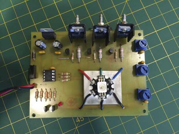 Con la excepción de la regulación de potencia, esto es esencialmente el mismo circuito repetido tres veces, uno para rojo, verde y azul. Tres de los pernos de los ATtiny - PB0, PB1, PB2 - se configuran como salidas y se utilizan para rápidamente encender y apagar un transistor usando PWM, que a su vez conectado enciende y apaga el LED rojo, verde o azul. (Un LED RGB es solo tres LEDs montados en un solo paquete). Los otros tres terminales el ATtiny13 - PB3, PB4 y PB5 - son configurados como entradas y pase a través de convertidor de analógico a digital de la viruta. Cada pin está conectado a un potenciómetro de 10K que actúa como un divisor del voltaje, proporciona de 0 a 5 voltios dependiendo de si la perilla se gira a la izquierda o derecha. El microcontrolador convierte esta tensión a un valor de 0-255, que luego utiliza para determinar qué porcentaje del tiempo es el pin de salida correspondiente, haciendo la posición de la perilla azul de brillo de LED azul, etc..
