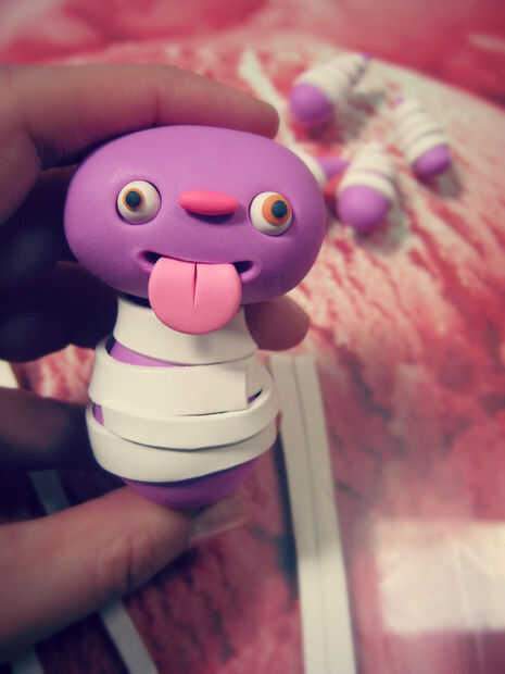 Tomar el cuerpo de la momia y la cabeza de la momia y coloque uno al otro por empujándolos juntos y alisar suavemente. También tomar el blanco rayas de arcilla y empezar a envolver el cuerpo!