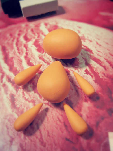 Con las manos estirar 4 formas de lágrima larga, 1 ¼" de largo, con cinta en un extremo y 3/8" de diámetro en el extremo ancho. Crear la cabeza que es de aproximadamente 1 ½" a través y ¾" de alto y 5/8" ancho. Crear el cuerpo, una gran gota que es cerca de 1 ½" largo. Todas las piezas retiradas.