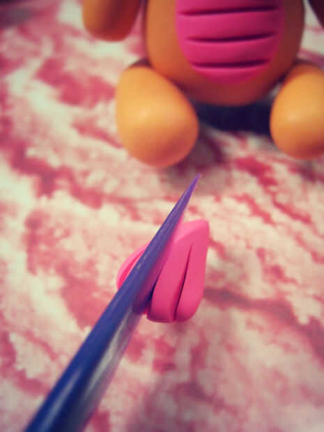 Utilizando arcilla rosa hacen un "mechón de cabello" para la parte superior de la cabeza del Cíclope - hacer una lágrima caer forma entonces líneas de corte en él con un cuchillo de arcilla. Hacer un agujero en la cima de la cabeza y empuje la rosa "pelo" en el orificio.