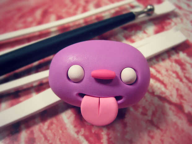 Formar 2 bolas pequeñas e introduzca en los ojos. Utilizando arcilla rosa añadir una nariz pequeña, oval entre los ojos. Con bolitas aplanadas de arcilla naranja y negro añadir un iris y la pupila en los ojos. Ahora apartar la cabeza de la momia.