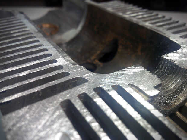 • Corté el motor por la mitad con una sierra para metales. Esto era sorprendentemente fácil. La aleación fue muy suave pero hubo inserción de cilindro de acero en el medio. Sólo tomó 30 minutos para cortar. Si quieres hacer este paso más fácil puede retroceder en el tiempo y trabajar más a menudo para que no se cansan los brazos.