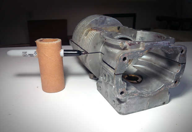 • Mi motor tenía una sección plana conveniente en la parte posterior para mantener la Plaza. Utilicé la plataforma hecha de un tubo de cartón que se muestra en la imagen de arriba para asegurar que la línea de corte fue perfectamente paralela a la mesa.