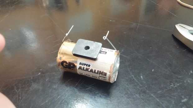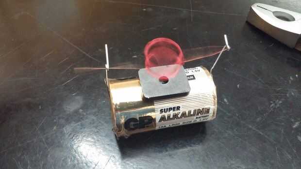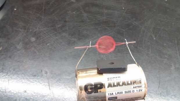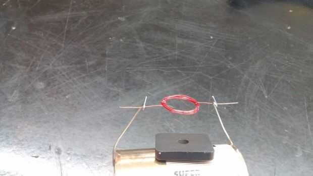 Ahora ponga la bobina a través de los hoyos en sus clips y darle una película. Puede acabar de spinning de los clips, en cuyo caso puede doblar los clips hacia adentro en sí mismos. Otra sugerencia es asegurarse de que la bobina está equilibrada. Usted puede cambiar esto doblando las puntas, o arrollar el alambre diferentemente