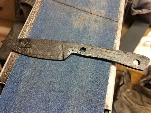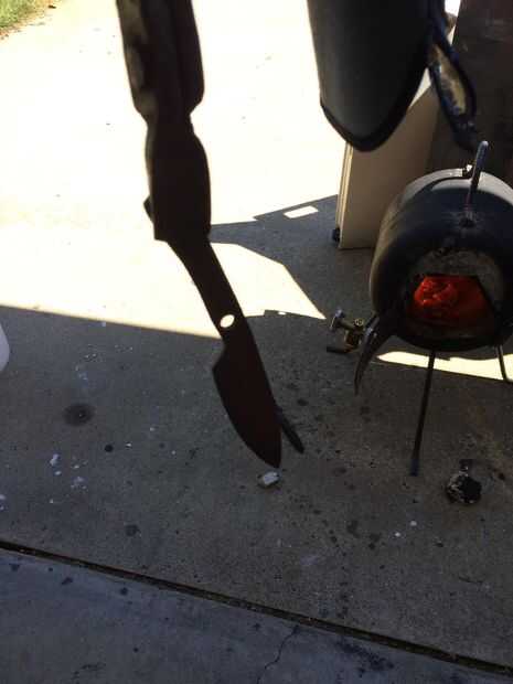 Antes del convite de calor, normalizar la hoja. Este estrenos estrés acumulados durante la forja y torcer y disminuyen la probabilidad de deformaciones durante el Temple. Para ello, calentar la hoja hasta por encima de su temperatura crítica (donde ya no es magnética, es útil mantener un imán grande alrededor), que aire fresco. Repetir esta operación 3 - 5 veces, que hice 5. Este paso también ayuda práctica de separar la cuchilla de la fragua, porque no puede haber ninguna duda al mudarse a la amortiguación. Estas son las fotos de mí colgando el cuchillo. Esta parte también es fresca, porque como oxidación se acumula se empezará a revelar lo patrón del acero.