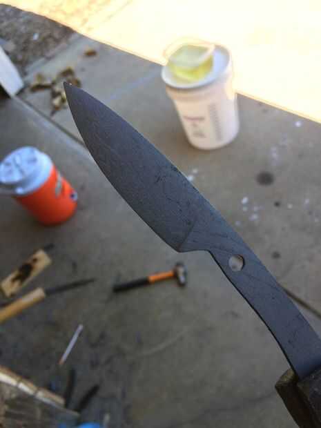 El Quench: Calentar para arriba una vez más por encima de su temperatura crítica, entonces rápidamente mover y saciar, borde-primero, en aceite vegetal caliente (si similar acero a la mía). Calentar el aceite, calentar un trozo de chatarra y echarlo en el aceite. He usado un pincho de RR. Suavemente moverla para obtener un Temple incluso. Si está utilizando un acero de alto carbono, no apagan en el agua, ya que esto podría quebrar su hoja – el agua refresca lo apagado mucho demasiado rápido para aceros high-carbon.