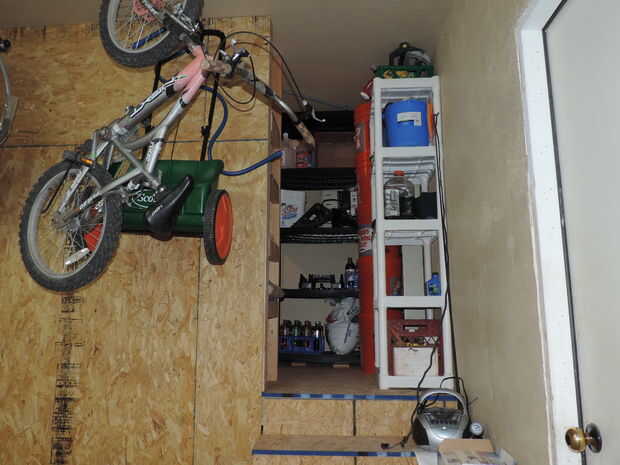 Marco 2 paredes hasta el techo, aproximadamente 3/16 tímido de su medida más corta, esto le permitirá fácilmente poner sus paredes. Después de que las paredes se construyen y atorníllelos en su lugar, en el piso del área de almacenamiento y cerchas del techo del garaje. Ahora corte y tornillo de 1/2 tableros de OSB a las paredes.