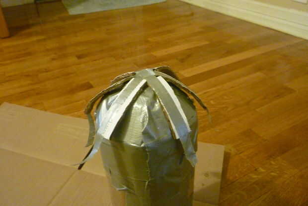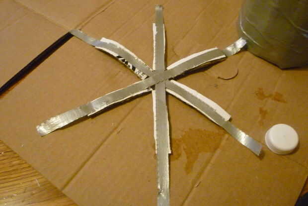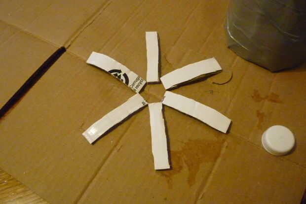 Cortar pequeñas tiras y conectarlos. Las piezas crean un hexágono en el centro. Con cinta adhesiva a la forma de 'cúpula'.