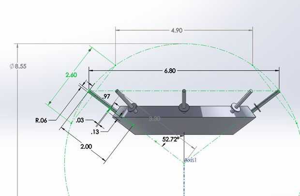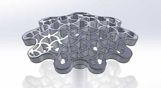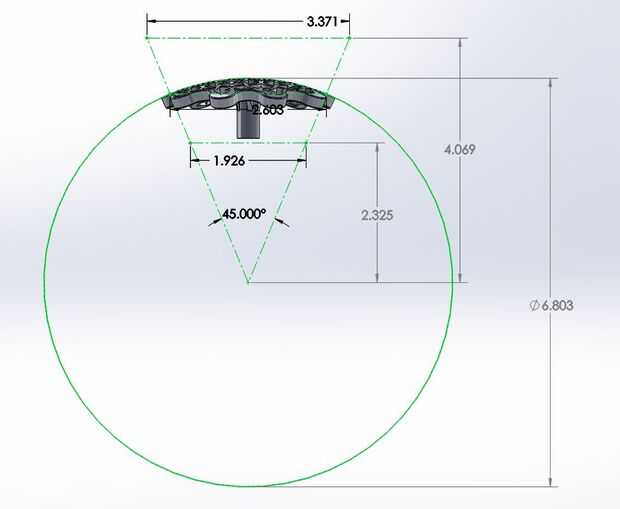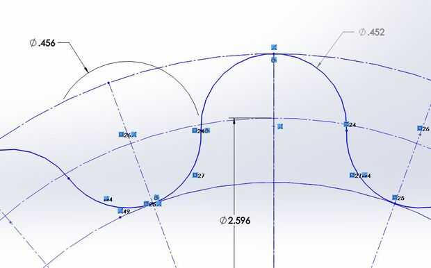 Comencé el diseño con los "artes de pétalos" que rodean a la máquina. Todos los trabajos de CAD se realizó en Solidworks. El diametro de los engranajes se generó simplemente escogiendo arbitrariamente un círculo que pasaría alrededor del perímetro del tren de engranajes de pétalo, en el centro de cada engranaje. Este número fue 6,803" y dividir en 8 secciones (8 velocidades), me da un diametro de 2,603".