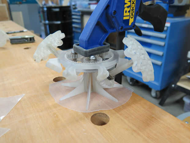Usé un collar de eje a eje central para evitar que la presión de uso de empujar el eje a través de la parte inferior de la máquina. Sin embargo, nada impide que el árbol se succiona hacia arriba y fuera de la máquina. Revisiones futuras pueden incluir espacio para un clip de sujeción por debajo de la máquina para prevenir esto.