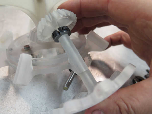 Yo eje diferentes collares para sujetar los engranajes cónicos de montaje final, pero como eran demasiado gruesos, tierra abajo un poco.