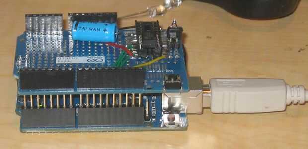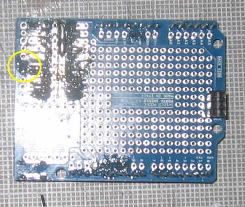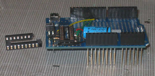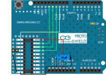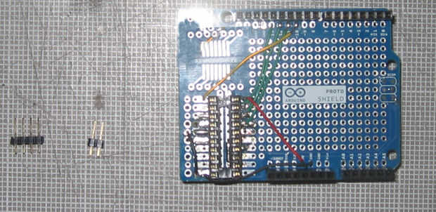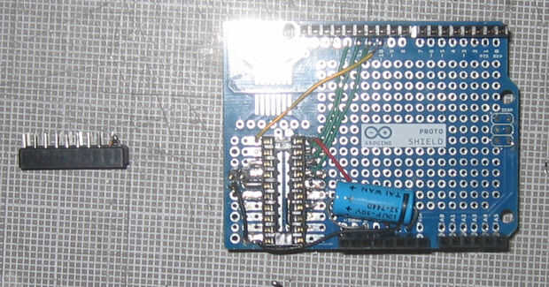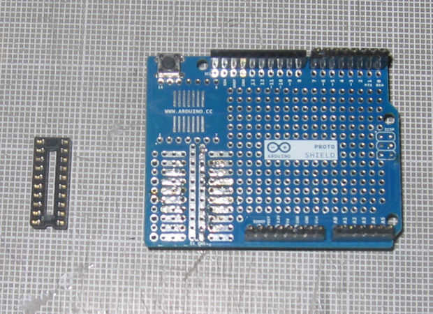 -Un Protoshield Arduino (alrededor de $18 en RadioShack con precios diferentes en las interwebs.) Esto es una gran herramienta para la construcción del escudo de una sola vez. Está a medio camino entre un pan y un PCB personalizado combinando los mejores aspectos de ambos. (Supongo que usted podría utilizar un PCB estándar perf-perforado con pins de cabecera, pero hay problemas con la orientación si haces eso. No entraré en la mecánica de este enfoque.) Ver la tercera imagen.