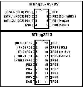 A limitar la discusión a la a minúscula 45/85 y 2313 porque estas unidades tienen asignacion de terminales lo suficientemente similares para reducir al mínimo los componentes y que representan una amplia gama de la memoria y las configuraciones de entrada/salida. (Desde que por primera vez en Tinys, he ido a través de proyectos con un diminuto media docena de 45 y soy no profesional de la ingeniería.) Si nos fijamos en la segunda imagen, a ver las configuraciones de pin para estas dos unidades. Los pines importantes aquí son Vcc, tierra, Reset, MISO (Master en / esclavo hacia fuera), MOSI (receptor en / maestro hacia fuera) y SCL o SCK (que son dos maneras de decir "Reloj Serial.") Aviso que casi todos estos pernos están en el mismo lugar en los dos paquetes con excepción de la tierra, que en el 45/85 es en pin 4 y en el 2313 es en el pin 10. En una solución permanente, si ejecutaste pin 4 a masa en el 2313, se estar conectada a los pines destinados el reloj externo, que podría causar problemas. Vamos a resolver este problema mediante el uso de un puente.