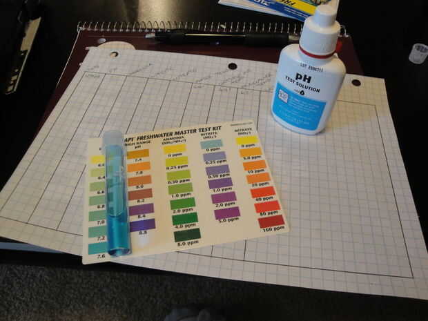 pruebo mi agua dos veces al día con un kit para acuarios que recogí en la tienda de mascotas. Vez en la mañana y una vez en la noche. Se puede ver en la imagen también mantener un registro de todos mis resultados y hacen notas sobre mis observaciones como la calidad del agua, cómo realizan los peces y todo lo de la nota. Cuando probaron mi agua mi pH era aproximadamente 8.0 pero ha mandilado lentamente hasta 7.6 en las últimas 2 semanas. Había también una pequeña cantidad de amoníaco presente pero que es normal de lo que he encontrado en mi investigación. Nitrito y nitrato fueron ambos 0. Después de 2 semanas tengo un pico repentino en amoniaco por lo que he dejado de alimentar a los peces hasta que reduce (que significa tengo crecimiento de bacterias beneficiosas. ¡ HOORAY!). Una vez están arriba y los que hay que hacer es alimentar a los peces, probar el agua, para verificar que todo funciona y espere hasta que usted puede cosechar vegetales frescos.