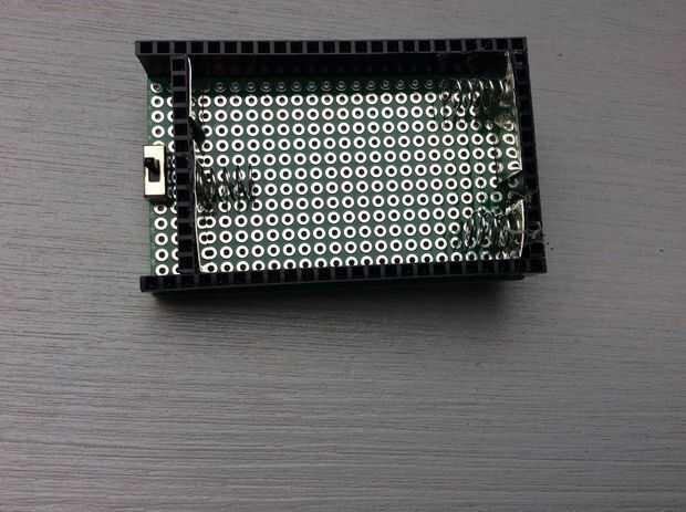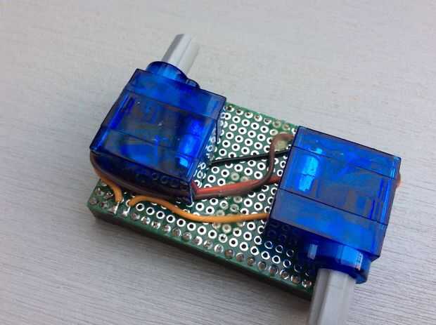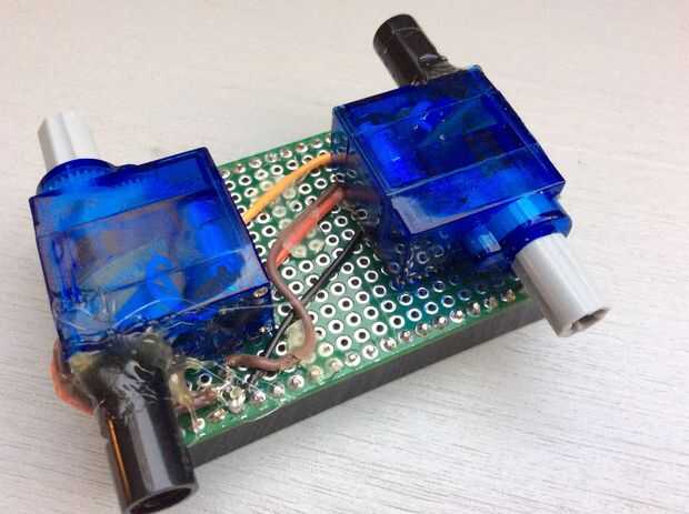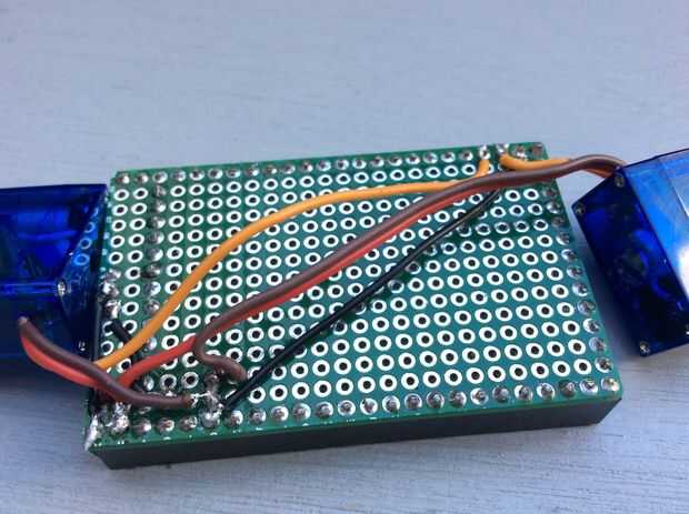 Primero tome una pieza de perfboard cortar creamos y soldar la cabecera femenino 13 pin a él y 24 pines como se muestra. Ahora es el momento de la soldadura en el interruptor y el pegamento y las piezas de metal de la soldadura, asegúrese de que la placa de posititive (uno sin resorte) está en el lado con el interruptor. Soldar un cable desde la placa positiva al interruptor y de la patilla central del interruptor a la izquierda bajo el pin. Conecte la placa negativa a la clavija de la sexta. Cortar el cable rojo de un servo a 2, 5cm y conectar con el segundo conector, el cable marrón a 3cm y conéctelo a la clavija 6 y el cable amarillo a 7, 5cm y conecte al pin 21 del otro lado. Tomar el otro servo y cortar el cable rojo de 8cm y conectar con el segundo conector, el cable marrón a 8cm y conecte al pin 6 y el cable amarillo a 2cm y conectarlo al pin 22 (se puede cortar mejor que un poco largo que a corto). Esa fue toda la soldadura para la parte de la unidad, cuando esté seguro de que las conexiones tienen razón que puede utilizar un poco de pegamento para fijarlos en su lugar, asegúrese de pegar en el centro y lo más cerca del extremo como sea posible. Para probarlo tienes que conectar un puente de alambre a los dos pines al lado del interruptor e inserte las baterías. Cuando usted mueva el interruptor de los servos deben resultar muy corto. Ahora lo que funciona puede utilizar pegamento caliente para fijar y fije las dos piezas de lego, como se muestra, asegúrese de no cubrir el agujero en el servo.
