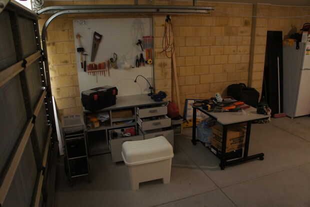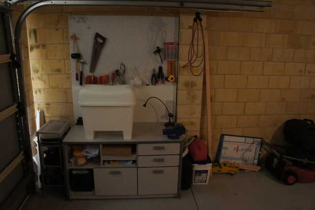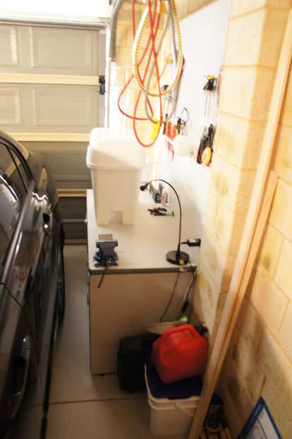 El tablero de clavija para las herramientas se han puesto hasta la semana pasada. Como se trata de una propiedad alquilada que no quiero taladrar las paredes, por lo tanto el pegboard está conectado directamente al Banco. Hará más fácil de poner para el siguiente movimiento de la manguera, cuando compre uno con un espacio adicional en el garaje de un taller adecuado.