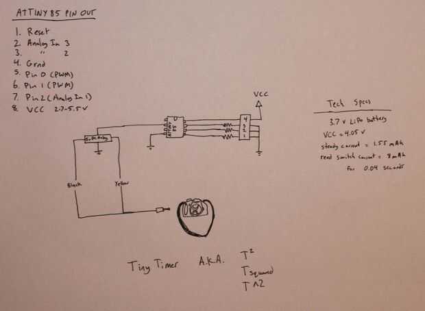 Es un diseño bastante simple como se ve en mi diseño original. 3 pines del interruptor actúa como un contador binario (dando 8 combinaciones diferentes) mientras que la extra interruptor sea un interruptor I/O . El ATTINY85 y Arduino tienen resistencias pullup en sus pines de salida digital que pueden saber el estado de un interruptor cuando esté conectado a tierra. Se nos ayude. Otra salida digital está conectado a un interruptor de relé de láminas de 5 voltios que utiliza un campo magnético creado por la corriente del microcontrolador para cerrar un interruptor interno que activa el obturador de la cámara.