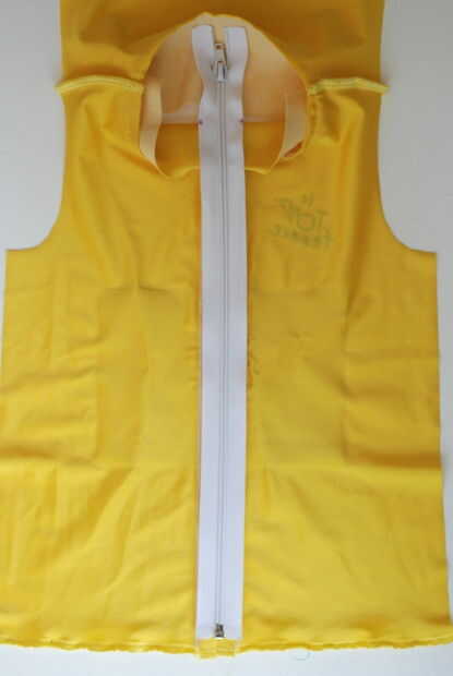 Ahora tenemos que comprobar cuánto debe ser tu código postal. Medir la longitud de la mitad de la parte inferior a la costura del cuello (no la parte superior del collar), agregar 1 y 1/8 pulgadas de la altura del cuello (o deducir cualquier medida que usted eligió en el paso 6 luego ½"(para el dobladillo en la parte inferior). Para el tamaño de 4T que necesitaba mi postal sea de 15 y para el 2T necesitaba ser 13″. Marcar la medida en tu código postal con tiza o un rotulador de tela desaparece, entonces la cremallera en su lugar en la parte superior para comprobar la mentira.
