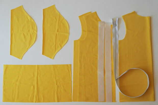 Vamos a cortar el cuello (y cuello de entretela) en un paso posterior. Ahora tienes las piezas muestran en la segunda foto.