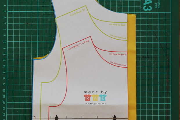También necesitará cortar una pieza extra para los bolsillos traseros. Utilicé la pieza principal y cortar la forma de la parte inferior a 7" por la camiseta de 4T. Al decidir cuán alto quieres la pieza de bolsillo Recuerde que perderá casi 1.5" de la altura a las costuras, así que corte 7" de alto da 5.5" de alto bolsillos.