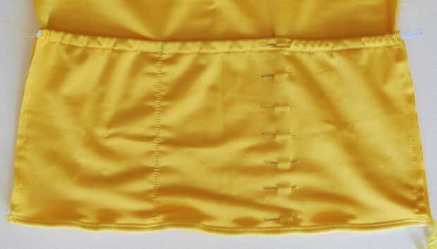 Encontré esta tela tenía una tendencia a deslizarse cuando estaba cosiendo juntos dos piezas a lo ancho (a pesar de usar un montón de pines), aunque estaba bien en la otra dirección. Si se utiliza una máquina de coser recomiendo unir las piezas con cinta hilvanado soluble en agua antes de coser en la parte inferior. No se preocupe si usted consigue un efecto ondulado en la costura de la parte inferior como la cubierta elástica que sumamos más adelante, se oculta esto.