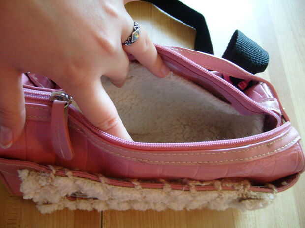 Último paso! Sólo cortar un pequeño trozo de tela (usé ante sherpa) e insertarla en tu mochila transportín nuevo! No conecte mina porque las ratas tienden a orinar sobre todo para marcar su territorio y quería ser capaz de sacar para lavar.