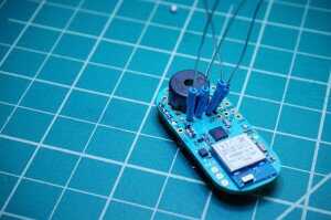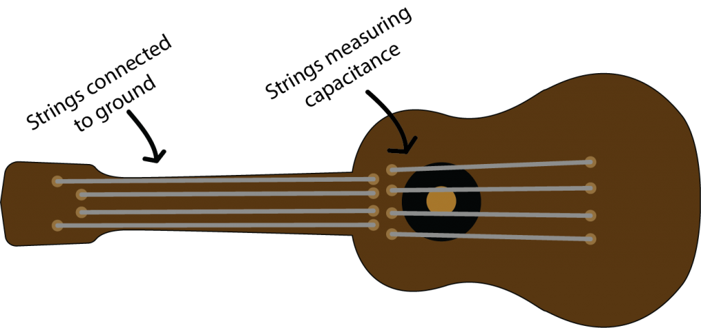 La persona tocando el ukelele necesitará conectarse a tierra por lo que tendremos dos conjuntos de cuerdas: un sistema que mide la capacitancia y un sistema que está conectado a tierra. "Cuerdas de tierra" es en el cuello del ukelele, y las "secuencias de tono" son en el cuerpo del ukelele.