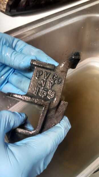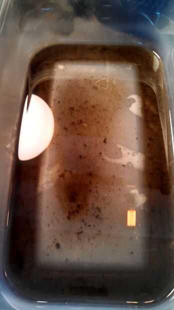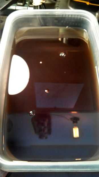 Como se puede ver que el solvente realmente tomó para sacar el moho y lo nublado. Y después quitando y verter el Evaporust de nuevo en la jarra, buena oxidación y pedacitos de corrosión en el envase. Deséchelo adecuadamente, aunque es soluble en agua.