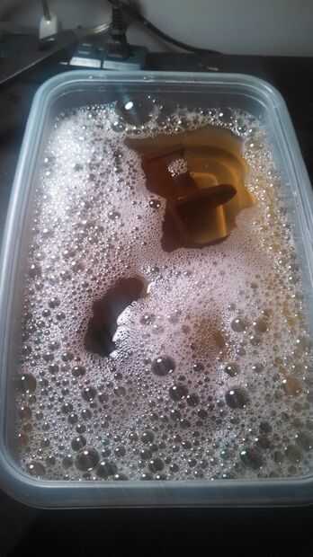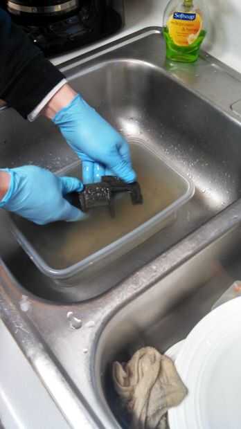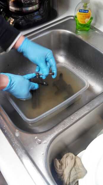 Una vez fuera el solvente, le di un baño de agua para enjuagar cualquier solvente residual. Que seguro que aunque enjuague todas las piezas móviles y zonas. Luego seca y lo atacó con aire.