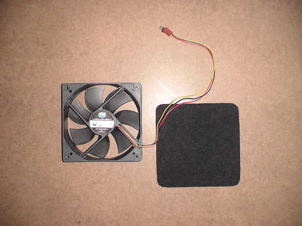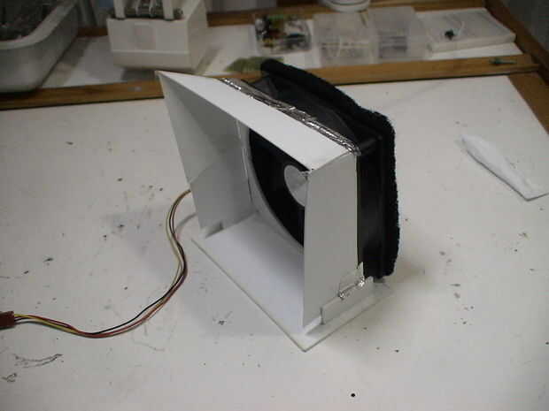 Esto es bastante simple, un ventilador de 120mm PC se une a un soporte. Y ha puesto algunos clavos en él para mantener el filtro de carbono, para una fácil sustitución.