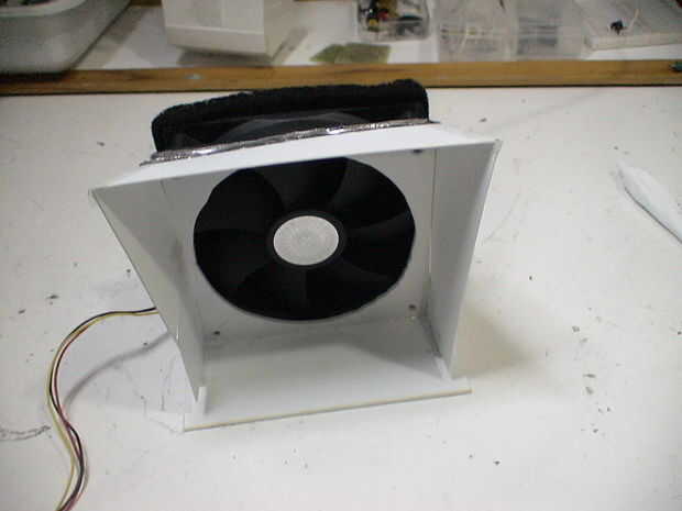 Después de que el pegamento se seca, tornillo del ventilador con filtro conectado a la base. Sólo necesita dos tornillos, busque los dos orificios que coinciden mejor.