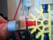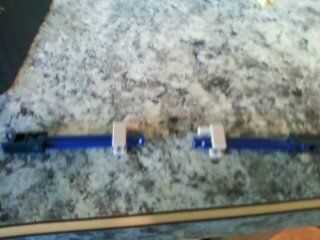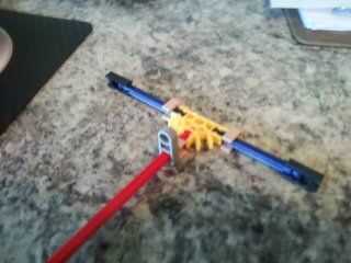 PIC 3: Conecte las varillas azules en los lados opuestos del conector amarillo. Asegúrese que los clips tan sobre la parte plana del conector amarillo para que no giran.  Al enganchar la varilla roja, ponga el lado con 2 clips. Deslice los dos atrás, conecte la varilla luego deslícelos tanto para arriba como van a ir. Se verá como la foto 4.