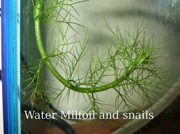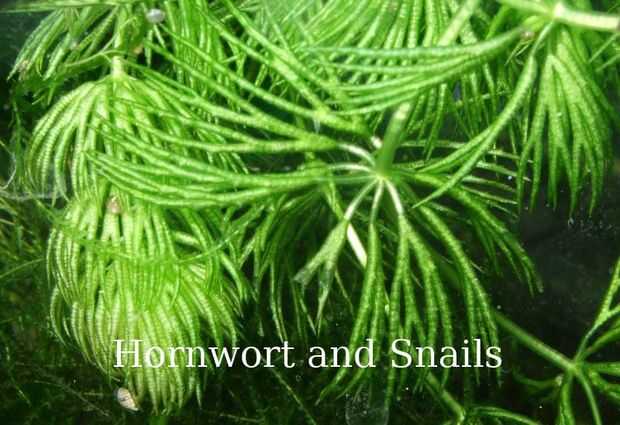 Ceratophyllum Demersum (Hornwort). Esta planta crece como loco! Creo que es demasiado duro para los caracoles comer aunque donde rompe la superficie del agua va suave y tal vez que los caracoles lo comen después. Por otro lado, proporciona gran cubierta y muchos lugares para pequeñas criaturas a ocultar, también un montón de alimentos que crecen en superficie. Una sola pieza pequeña de este eventualmente se multiplican y llenar el tanque entero para que no use esto a menos que seas feliz con la poda. Los caracoles como poniendo sus huevos en él, también.