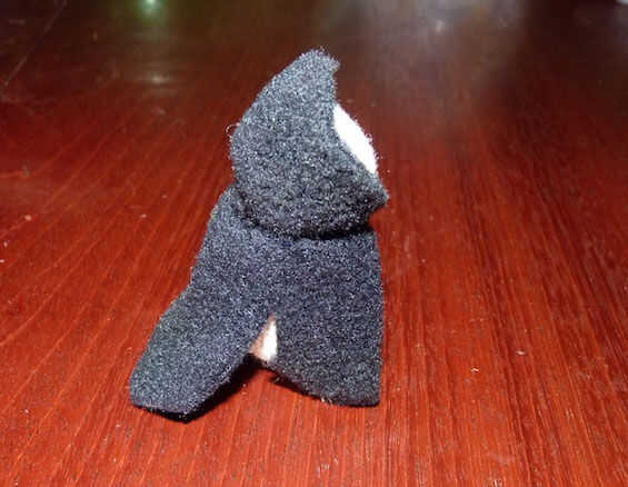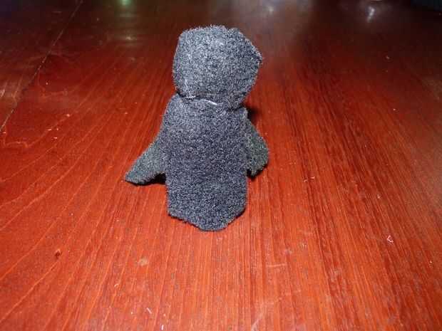 Paso 4. Coloque las alas y la cola en el cuerpo del pingüino pequeño con una goma clara. La parte superior de la tela forma una especie de campana para que la parte negra de la cabeza del pingüino.