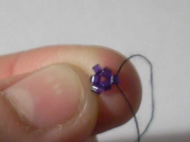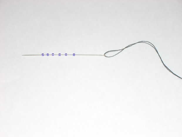 Aguja de hilo con una longitud de brazos dobles de hilo. Hacer doble no hilo. Añadir 6 granos
