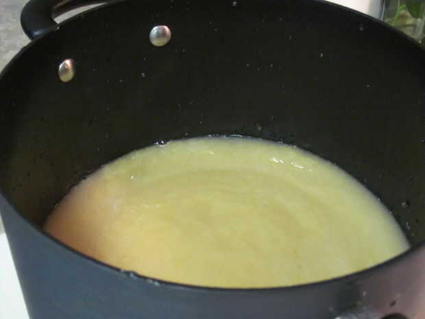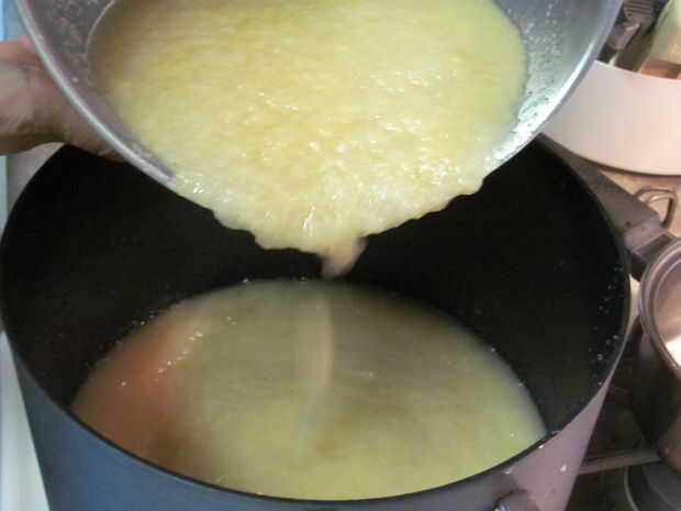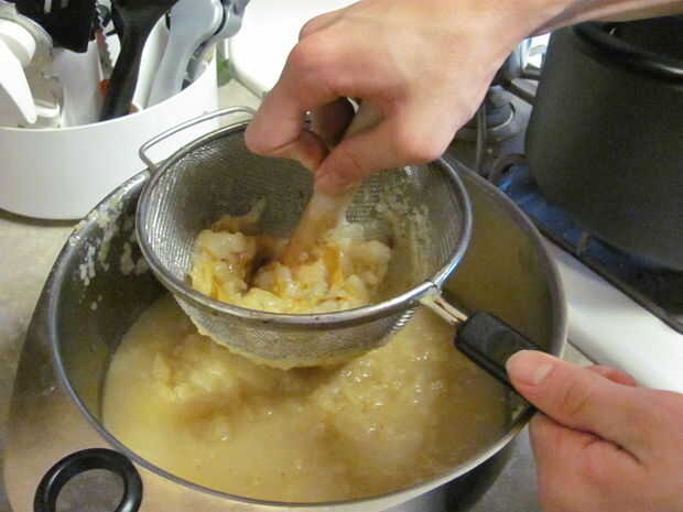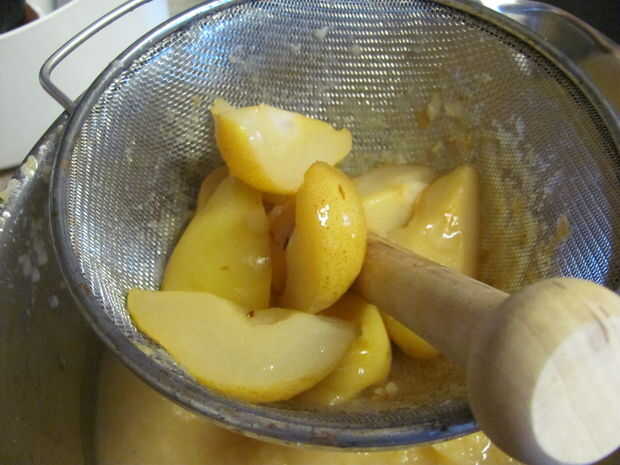 Retirar del fuego y presionar la pera a través de un colador o un pasapurés. Como se puede ver, no tengo una comida el molino (aunque he oído la encontró aquí es bastante buena), así que me fui de la manera más barata y sólo presiona a través de un colador. Asegúrese de elegir una resistente para que no se rompe!