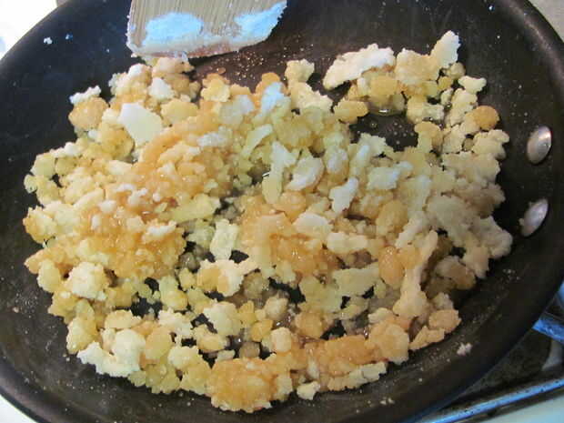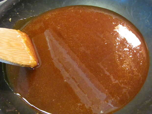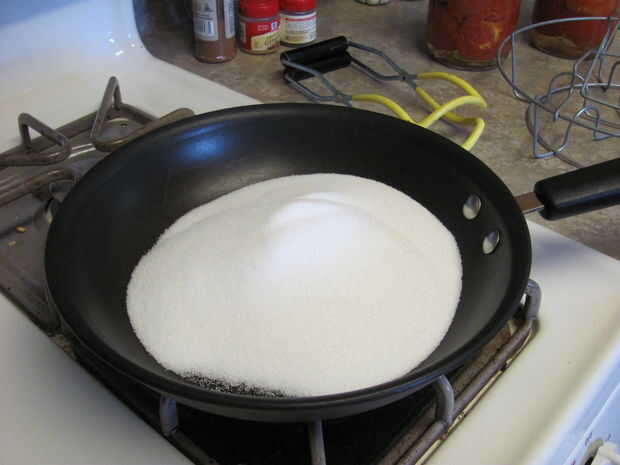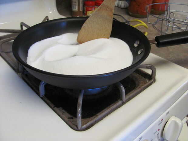 Usar una sartén, calentar 1 1/2 tazas de azúcar a fuego medio-bajo, revolviendo hasta que se funda y caramelice a un color marrón medio. Puede ver la progresión de la misma en las fotos.