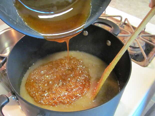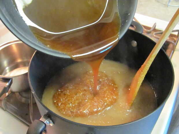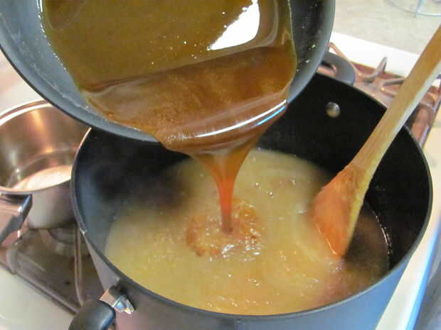 Vierta inmediatamente en la pulpa de la pera (el almíbar se chisporroteo y endurecer, pero disolver otra vez como el cocinero de conservas). Cuando viertes en, comenzará a burbujear up...no necesidad de preocuparse! Incluso no importa si endurece en su agitación utensilio... eventualmente se calentar y disolver otra vez!