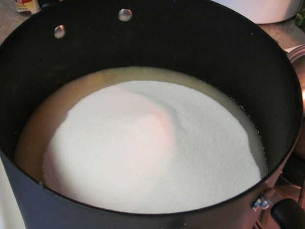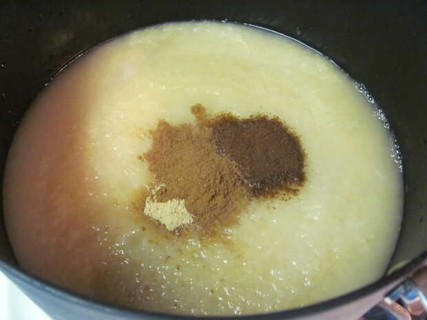 Añadir el azúcar restante, clavo, canela y jengibre. Cocinar destapado, hasta que espese (unos 45 minutos). Revuelva con frecuencia comienza a espesar para evitar que se pegue. Agregue el jugo de limón justo antes de retirar del fuego.