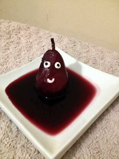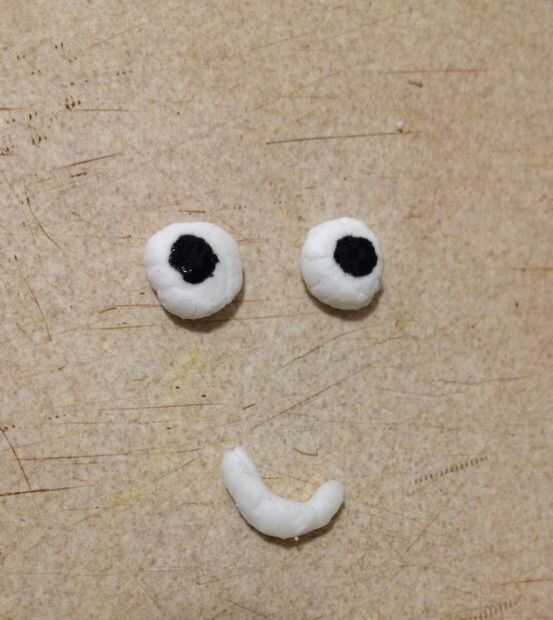 Para ojos comestibles, forma el fondant como bolas de ojos y boca, luego pegar en la pera.