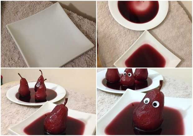 Tome un plato para servir, cuchara jarabe vino rojo en la placa. Colocar las peras poches en el centro de la placa.