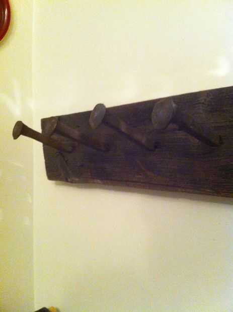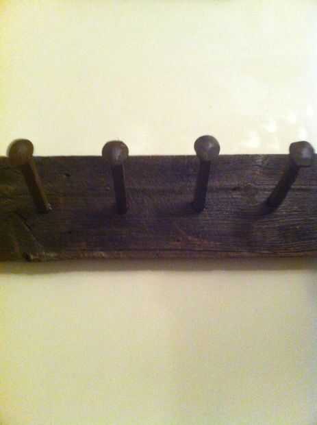Mi esposa recientemente recogió algunas espigas de ferrocarril antiguo en una venta de garaje y quería convertirlos en una especie de percha. Un rato más tarde, nos recogió un viejo pedazo de Junta de granero de un mercado de pulgas por $5. Finalmente tenía todo lo que necesitaba para hacer un colgador de ropa de estilo antiguo pared montado!