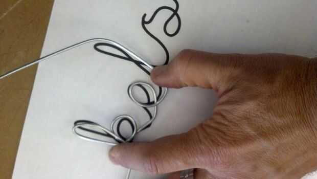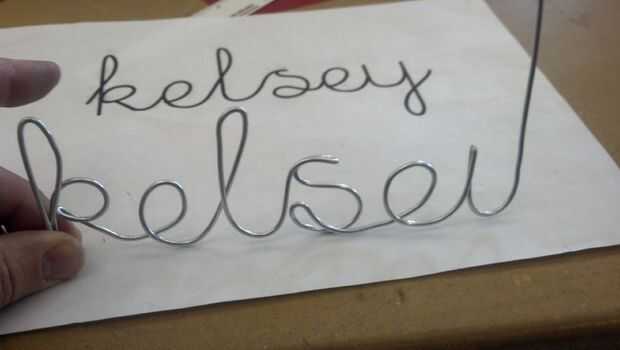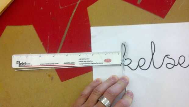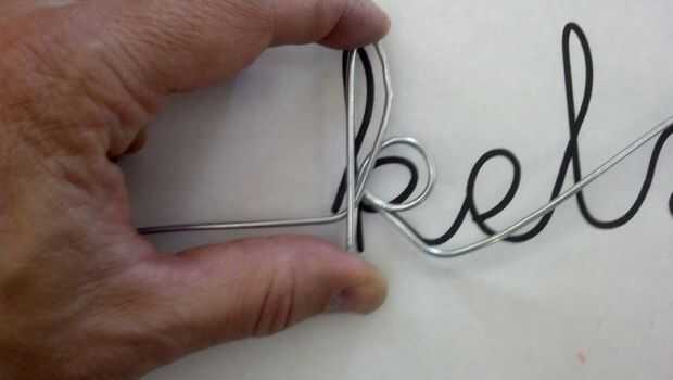 Luego de realizar su primera curva unos 8" desde el extremo del cable siguiendo la plantilla. Usando sus manos y plyers seguir la plantilla tanto como sea posible. Nunca obtengo perfecto; sólo mantener un ojo en el tamaño de las letras y la línea de base.