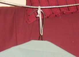 Mientras sujeta el gancho con la mano derecha y con la parte superior de la percha por encima del nivel de la ropa sí mismo, pasar el elástico (nudo en la parte superior) sobre y detrás del tendedero. Usar la mano izquierda para agarrar el extremo anudado que ha pasado en el tendedero. Baje con cuidado la suspensión para que la parte superior está ahora por debajo de la ropa (que se se ahora ser estirar el elástico algo). Deslice la punta de la percha a través del lazo elástico por encima del nudo. Al liberar la tensión, la parte superior de la percha caerá un poco por debajo de la ropa sí mismo, permitiendo un grado de "giro libre" en el viento. Para evitar que se deslice demasiado otras cosas en el tendedero, colocar una pinza para la ropa de ese lado, cerca del elástico (tenderá a deslizarse en esa dirección).