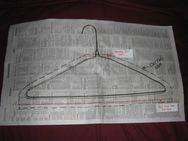 Usar un robusto hangar de alambre como la plantilla. Trace una línea alrededor de la parte triangular inferior. Añadir 1/2 pulgada de margen de costura a lo largo de la parte superior, aumentando en 3/4 de pulgada en las esquinas y el margen de costura de 1 pulgada en la parte inferior. Esto recorta y utiliza como el patrón.