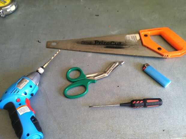 Tornillo pistola/taladro, Sierra de mano, más ligera, tijeras o algo para cortar el paracord y algo puntiagudos para empujar la paracord a través de los agujeros.