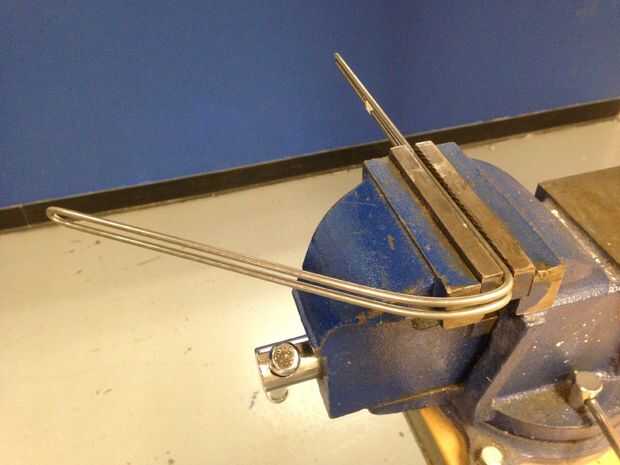 Retire el tornillo de banco y completar la curva para que la barra se dobla por la mitad. Utiliza la prensa otra vez a hacer la curva agradable y apretado.