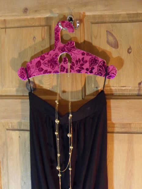 Las suspensiones están diseñadas para sostener un collar en el medio y tiene hendiduras en los extremos para sujetar los vestidos y tops. También podría agregar características para sostener pantalones o corbatas.