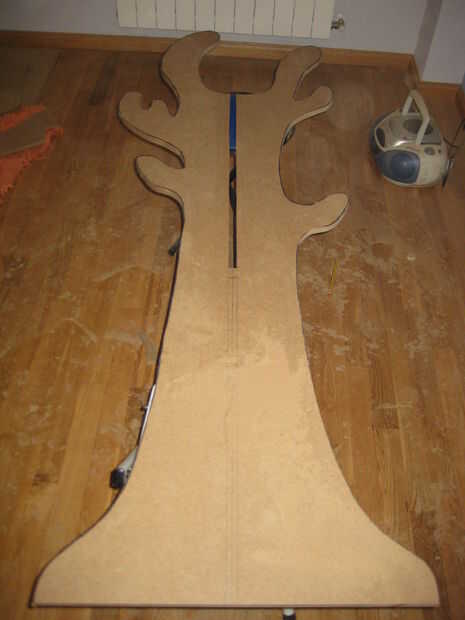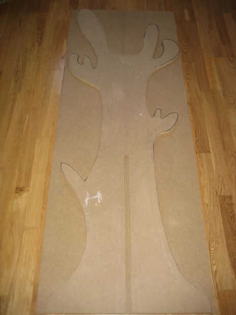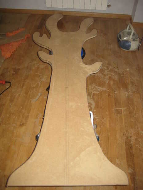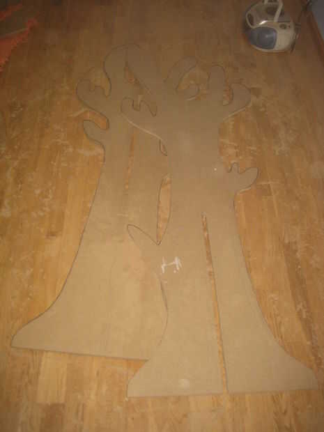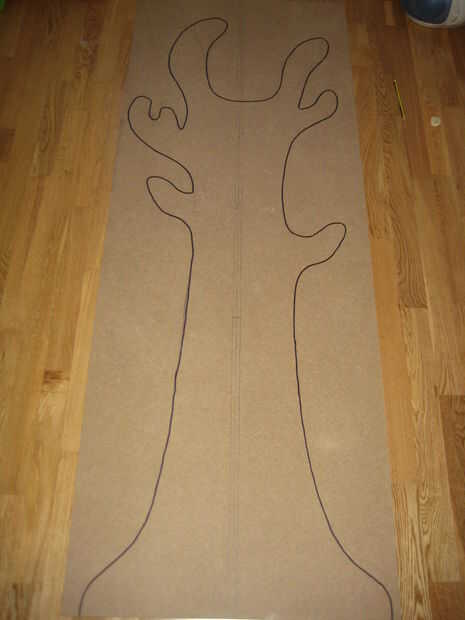 Cogemos el tablero ya cortado y trazamos su contorno sobre el segundo tablero. Aquí podemos hacer un diseño simétrico, teniendo las dos partes exactamente iguales, o marco un poco el diseño de las ramas como hice yo. Lo sí hay tener en cuenta es el ancho del tronco sea similar y, sobre todo, la altura sea la misma.