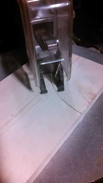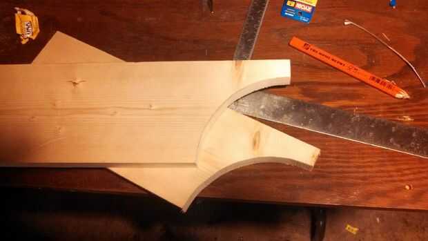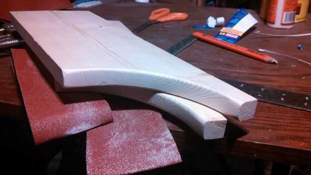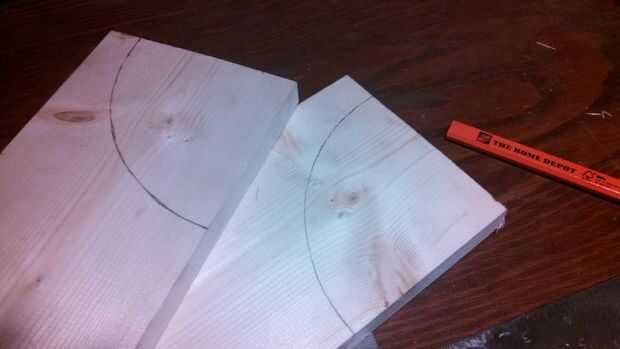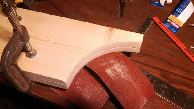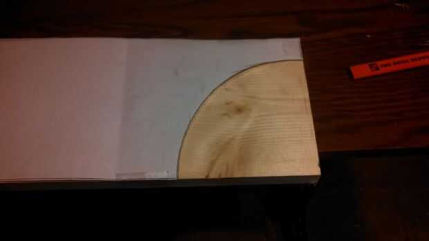 El segundo corte fue cortar el radio. Primero imprimí una copia de toda la escala del lado y trazó el arco sobre el tablero. Luego se trasladó a la Sierra de calar. Yo utiliza la Sierra de calar porque eso es lo que tengo este corte puede hacerse con otras sierras también. Una vez que se cortan ambos lados les afianzado con abrazadera juntas y les había lijado a mano hasta el emparejado. El próximo toque redondea los bordes de la curva lijando.